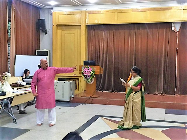 毕业于北京大学印地语专业的校友,中国的印度舞蹈专家金珊珊女士介绍了她编导泰戈尔《齐德拉》音乐舞蹈史诗剧的经验,并和她的学生们展现了古典印度舞蹈之美。印度国际大学外国语学院院长阿维杰特•森教授(Prof. Abhijit Sen)在他有关泰戈尔戏剧发展史的学术报告中,邀请国际大学艺术家高什夫妇( Avik Ghosh/Ms. Gargi Ghosh)呈现了六部泰戈尔经典戏剧的精彩片段。孟加拉国77岁的资深艺术家阿达乌尔•拉赫曼(Mr. Ataur Rahman)为大会做了“孟加拉国泰戈尔戏剧演出史”的精彩大会发言,并与印度艺术家咖尔吉•高什(Ms. Gargi Ghosh)表演了泰戈尔《红夹竹桃》的精彩片段。《红夹竹桃》是泰戈尔最有代表性的戏剧作品之一,本次演出是该剧在中国的首演,演出剧本改编自北京大学资深教授刘安武先生的译本,北京大学 “泰戈尔导读”课程团队参与组织,北京大学六位学子和玺莹仁剧团联合六位国际友人,插入多语种朗诵片段。与会者认为演出独具特色,创新性地表现了《红夹竹桃》的意义。